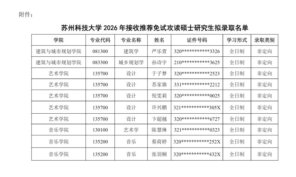 附件:苏州科技大学2026年接收推荐免试攻读硕士研究生拟录取名单
