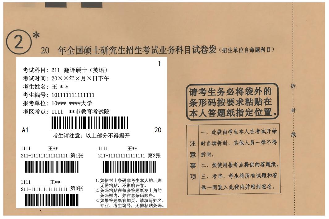 我校艺术类及设计类科目(考试科目代码为9**)无需粘贴条形码,考生须认真核对试题袋上的个人信息,切勿撕下粘贴。请考生依据准考证上招生单位说明信息自备考试用品(工具),并按试题要求在自带考试用纸指定位置填写本人姓名、准考证号。
