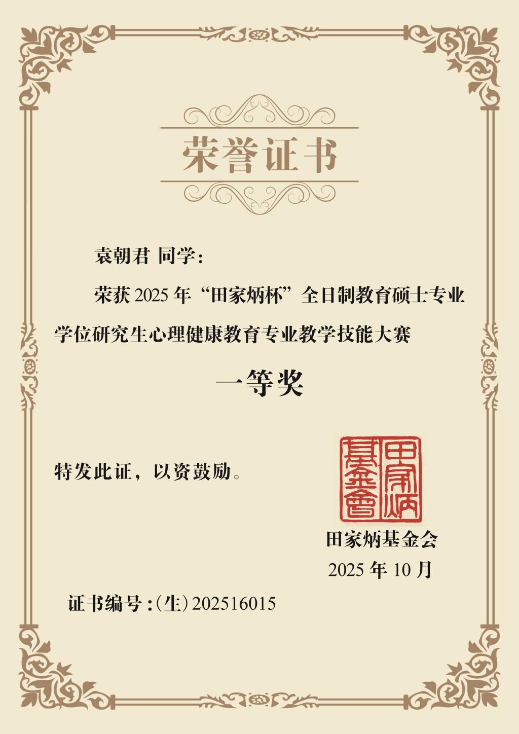 近日,2025年全国“田家炳杯”全日制教育硕士专业学位研究生心理健康教育教学技能大赛决赛在东北师范大学举行。经过激烈角逐,我校教育学院2023级硕士研究生王俪蒙(指导老师:韦洪涛)、袁朝君(指导老师:陈艾睿)均获一等奖,熊孝娟(指导老师:韦洪涛)荣获三等奖,韦洪涛、陈艾睿被评为“优秀指导教师”。
