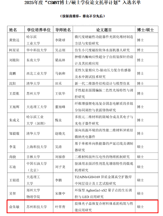 近日,中国微米纳米技术学会(CSMNT)公布了2025年度“CSMNT博士/硕士学位论文托举计划”评选结果,材料科学与工程学院2024届研究生俞朱敏的硕士学位论文《胶体光子晶体复合材料体系的构筑与性能应用研究》成功入选。