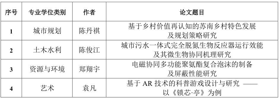 根据《省教育厅办公室关于开展2024年江苏省优秀博士硕士学位论文推荐工作的通知》(苏教办评函[2024]12号)精神,经个人申报、学院推荐、学校组织评审,现将2024年江苏省优秀硕士学位论文校内推选结果公示如下:
