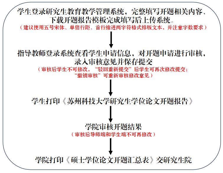 论文开题工作由各学院自行安排,各学院研究生需于12月26日前完成开题工作,并提交《苏州科技大学研究生学位论文开题报告》,一式两份,学院留存;《硕士学位论文开题汇总表》,一式一份,12月26日15:00前报研究生院备案,并完成系统录入工作。