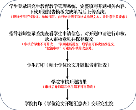 研究生须登陆研究生管理系统,进行学位论文开题信息的网上录入(中期考核相关信息完备,才可以操作),指导教师对研究生的开题进行审核,学院审核开题情况并给出开题结果,操作程序如下: